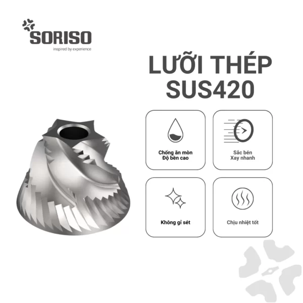Lưỡi xay 7 cánh bằng thép không gỉ SUS420 – vật liệu được dùng trong công nghệ y tế và dụng cụ cắt cao cấp, đem đến hiệu suất xay nhanh – sắc – không sinh nhiệt. Tìm hiểu về SUS420.